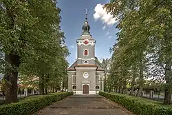 - Die römisch-katholische Hedwigskirche (Kościół św. Jadwigi) wurde 1805 im Stil des Klassizismuses errichtet. Der vorherige Holzbau wurde 1804 abgerissen.[3] Die Kirche steht seit 1966 unter Denkmalschutz.[7]