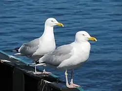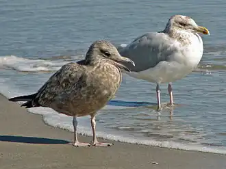 Kanadamöwe (Larus smithsonianus), adulter Vogel im Winterkleid und subadulter Vogel (vorne)