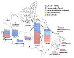 Die Wahlbeteiligung lag mit 68,66 % deutlich über der der vorangegangenen Wahl (62,25 %). Im Ergebnis zeigte sich ein Wahlsieg der Liberalen Partei. Die Partei hatte nach ihrem Tief in den Meinungsumfragen Anfang Januar 2025 einen spektakulären Wiederaufstieg geschafft und gewann bei der Wahl im Vergleich zu 2021 sowohl die relative Stimmenmehrheit als auch die relative Mandatsmehrheit sowie das beste Ergebnis seit 1968. Mit 169 gewonnenen Wahlkreisen (49,4 %) verfehlte sie knapp die absolute Mehrheit. Die Konservativen gewannen zwar ebenfalls deutlich an Stimmen und Mandaten hinzu, kamen damit aber nur auf den zweiten Platz. Der konservative Spitzenkandidat Pierre Poilievre verlor seinen seit 2004 gehaltenen Wahlkreis Carleton in Ontario an den liberalen Gegenkandidaten.[3] Hauptverlier der Wahl war die NDP, die fast zwei Drittel ihrer Wählerschaft verlor und von 24 auf 7 Unterhaussitze reduziert wurde. Dadurch verlor sie auch den Status als „offizielle Partei“, für den mindestens zwölf Unterhaussitze notwendig sind. Dies bedeutete für die Partei einen erheblichen Verlust an staatlicher Unterstützung. Die Grünen verloren einen der beiden von ihnen gehaltenen Wahlkreise und waren künftig nur noch mit ihrer Parteivorsitzenden Elizabeth May (Wahlkreis Saanich-Gulf Islands in British Columbia) im Unterhaus vertreten. Alle anderen Parteien und Einzelbewerber gingen leer aus.