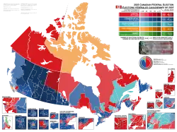 Dies war die erste Wahl, bei der eine geänderte Einteilung mit 343 Unterhauswahlkreisen verwendet wurde, die auf der kanadischen Volkszählung von 2021 basiert.[24] Änderungen bezüglich der Zahl der Wahlkreise ergaben sich für die Provinzen Ontario (plus ein Sitz), British Columbia (plus ein Sitz) sowie Alberta (plus drei Sitze). Die Wahlbezirke für jede der zehn Provinzen wurden zwischen dem 14. Februar und dem 8. Juli 2023 festgelegt und am 22. September 2023 offiziell bekanntgegeben.[25] Die vorherige Wahlkreiseinteilung mit 338 Wahlkreisen wäre verwendet worden, wenn die Wahl vor dem 23. April 2024 ausgerufen worden wäre.