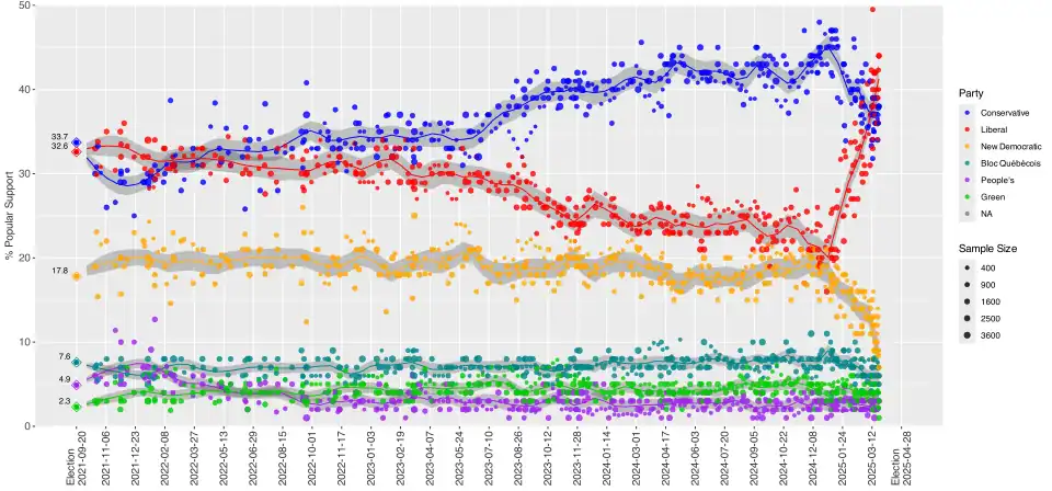 Seit der letzten Wahl hatten die Liberalen kontinuierlich an Zustimmung verloren. Einen Tiefpunkt erreichten sie mit etwa 20 Prozent Zustimmung Anfang 2025. Danach zeigte sich ein steiler Wiederaufstieg der Partei in der öffentlichen Meinung. Dafür waren im Wesentlichen drei Ereignisse verantwortlich: der Rücktritt Trudeaus, die Amtsübernahme Donald Trumps in den Vereinigten Staaten, und der Aufstieg Mark Carneys als neuer Parteiführer der Liberalen.[19]