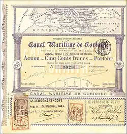 - ↑ Société Internationale du Canal Maritime de Corinthe (Internationale Gesellschaft des Seekanals von Korinth) 1882–1890 (KK010a). eWertpapiermuseum des EDHAC e. V., abgerufen am 24. Juli 2022.