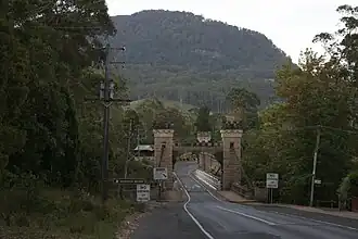 In der Kleinstadt Kangaroo Valley überspannt die historische Hampden Bridge den Fluss.[3]