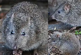 Langschnauzen-Kaninchenkänguru (Potorous tridactylus) in drei Ansichten. | ||||||||||||