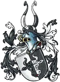 - Blasonierung des Stammwappens: Der Schild gespalten von Silber und Schwarz. Über das Ganze ein gespaltener Stierkopf mit gewechselten Farben. Auf dem schwarz-silbern gewulsteten Helm zwei von schwarz-silber über Eck geteilte Büffelhörner. Die Helmdecken sind schwarz-silbern.[7]