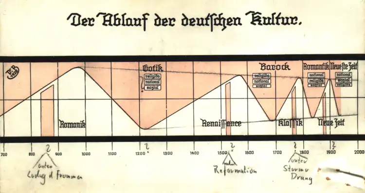 Skizze aus: Dr. E. Brenner, Deutsche Literaturgeschichte, 13. Auflage, 122–131. Tsd. Mit einer farbigen Beilage (Wunsiedel / Wels / Zürich, 1952).