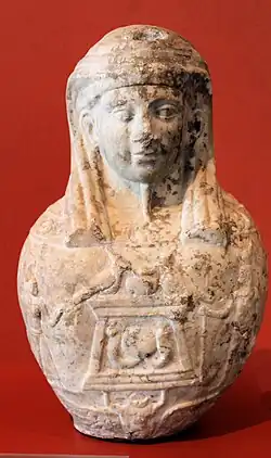 Später wurde Kanopus mit Osiris verschmolzen und wurde als Krug oder eiförmiges Objekt mit menschlichem Kopf dargestellt.[3] Seine Gemahlin war die Göttin Menuthis, eine Lokalform der Isis.[2] In der Folge wurden in der Ägyptologie alle derartigen Gefäße als Kanopen bezeichnet.[4]