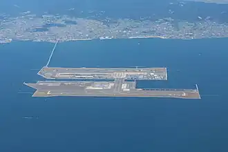 Die Flughafen-Insel ist rund 4 km lang und 1,2 km breit und wurde mit 430 Millionen m³ Lehm aufgeschüttet.[4] Der Bau kostete rund 20 Milliarden US$.[5]