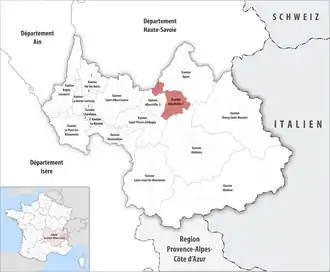 - ↑ Nur der nordöstliche Teil der Gemeinde, der Rest gehört zum Kanton Albertville-2.