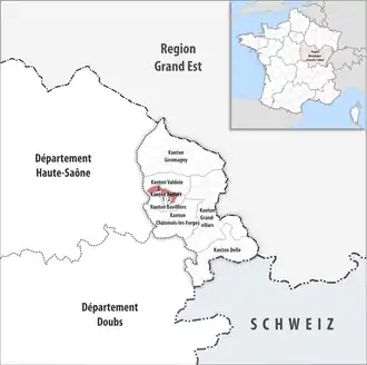 ![]() Lage des Kantons Belfort-3 im Département Territoire de Belfort | |