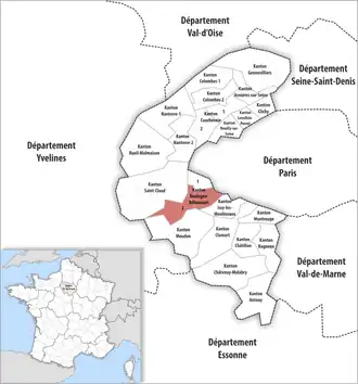- ↑ Nur der südliche Teil der Gemeinde, der Rest gehört zum Kanton Boulogne-Billancourt-1.
