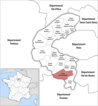 ![]() Lage des Kantons Châtenay-Malabry im Département Hauts-de-Seine | |