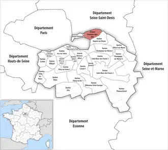 - ↑ Nur der östliche Teil der Gemeinde, der Rest gehört zum Kanton Vincennes.