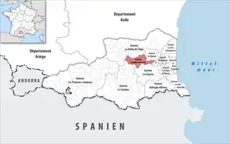![]() Lage des Kantons La Vallée de la Têt im Département Pyrénées-Orientales | |
