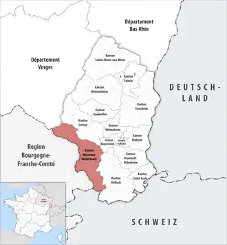 ![]() Lage des Kantons Masevaux-Niederbruck im Département Haut-Rhin | |