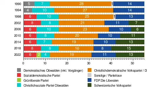 Bei den Wahlen erreichten die angetretenen Parteien folgende Sitzzahlen und Stimmanteile.[5] Zu beachten ist, dass bis zu den Wahlen 1986 die Anzahl der Kantonsratssitze variierte. Seit 1990 ist sie auf 55 festgelegt. Ebenfalls ist zu beachten, dass bis 1982 im Majorzverfahren gewählt wurde; seit 1986 gilt für alle Gemeinden das Proporzverfahren.[6] Die Christlichsoziale Partei Obwalden wird nachfolgend bis 1978 zur CVP gerechnet, da die beiden eine Fraktionsgemeinschaft bildeten. Seit 1982 politisiert die CSP OW in einer eigenen Fraktion. 2002 verliess sie die CVP Schweiz und war von 2005 bis 2010 der Christlich-sozialen Partei der Schweiz angegliedert.