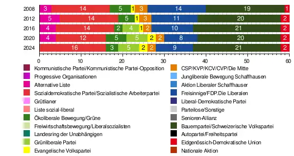 Per Dekret vom 24. November 2003[9] wird der Kanton Schaffhausen in sechs Wahlkreise unterteilt. Die 60 Volksvertreter sind gemäss Volkszählungsergebnis des Jahres 2018 wie folgt verteilt: