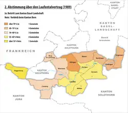 Die zweite Laufental-Abstimmung am 12. November 1989 verzeichnete eine rekordhohe Stimmbeteiligung von 93,6 %. Dabei setzten sich die Befürworter des Beitritts zu Basel-Landschaft mit 51,7 % der Stimmen durch. In allen Gemeinden ausser Roggenburg (das eine leichte Zunahme des Nein-Anteils verzeichnete) konnten sie zum Teil deutlich zulegen. 8 von 13 Gemeinden stimmten der Frage «Wollt Ihr Euch aufgrund des vereinbarten Vertrages vom 10. Februar 1983 und seiner Ergänzung vom 12. Mai 1989 dem Kanton Basel-Landschaft anschliessen?» zu, wobei die Gemeinden Burg im Leimental, Duggingen, Liesberg und Röschenz ins Ja-Lager wechselten.[42][81] Die Berntreuen erklärten ihre Niederlage mit den zahlreichen Zugezogenen aus der Nordwestschweiz, die sich in den vergangenen sechs Jahren im Laufental niedergelassen hatten. Hingegen wiesen die Sieger auf die hohe demokratische Legitimation hin; der Stimmenzuwachs sei das Ergebnis einer eigentlichen Trendwende. Bereits am folgenden Tag kündigte die ABL eine Beschwerde gegen die Abstimmung an, was die LB umgehend als Verzögerungstaktik verurteilte.[82] Daraufhin formierten sich die beiden gegnerischen Blöcke neu: Die Antiseparatisten bündelten ihre Kräfte in der Vereinigung berntreuer Laufentaler (VBL) und gründeten eine eigene Jugendbewegung namens «Wildschweine» (eine Anspielung auf die bernjurassischen Sangliers)[83], während LB, «Jo zum Baselbiet», die JKL und die «Frauen und Mütter für Baselland» sich zu Laufental 91 zusammenschlossen.[84]