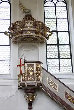 Die hölzerne Kanzel im Stil der Renaissance wurde vermutlich nach einem Entwurf von Joseph Heintz geschaffen. Der sechsseitige Kanzelkorb mit einer großen Volutenkonsole mit einem geflügelten Engelskopf ist mit vergoldeten Schnitzornamenten versehen.
