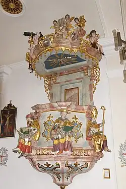 Am Schalldeckel sind die Symbole der vier Evangelisten angebracht, und zwei Putti halten die Gesetzestafeln. An der Unterseite ist die Heiliggeisttaube zu sehen.