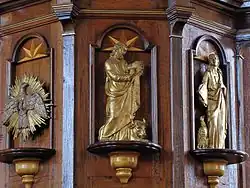 An der Rückwand ist Johannes der Täufer dargestellt, der dem Volk die Ankunft des Messias verkündet. Der Schalldeckel wird von den Gesetzestafeln und einem Kreuz bekrönt.