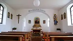 Der Betraum hat eine Flachdecke sowie eine eingezogene Chorwand. Der rechteckige Altarraum ist ebenfalls flach gedeckt.