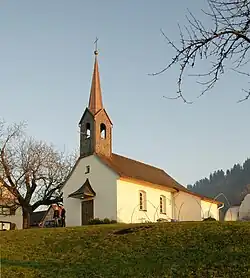 Es handelt sich um einen Bau mit rechteckiger Grundform und Südost/Nordwest-Ausrichtung. Südöstlich (Altar) sind die Außenwände abgerundet. Die einfache Holztüre und der Glockendachreiter auf dem Satteldach mit achteckigem Spitzhelm befinden sich nordwestlich. Auf der Evangelienseite befindet sich eine angebaute Sakristei.