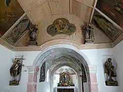 Der Betraum hat ein, einem Tonnengewölbe nachgebildete Decke (sechseckig), welche teilweise mit Bildern bemalt ist und eine eingezogene Chorwand.