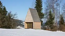 Die monolithisch wirkende Kapelle ist schlicht ausgeführt und wurde vom Architekten Bernardo Bader entworfen.