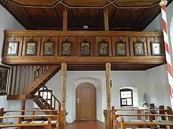 - 14 Bildtafeln des Kreuzwegs an der Empore und den Seitenwänden.