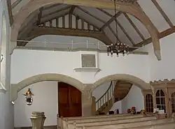 Das Kircheninnere, besonders die Empore, erinnert an die Zeit der Romanik. Der sichtbare Dachstuhl ist tonnenartig gewölbt. Im Altarraum fallen zwei neugotische Fenster auf.