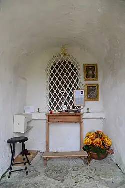 Die Kapelle ist mit einem sehr flachen Satteldach aus großen Steinplatten gedeckt. Der Boden ist ebenfalls mit Steinplatten ausgelegt.