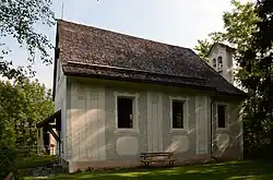 Bei der Kapelle handelt es sich um eine zweijochige Kapelle mit rechteckigem Grundriss und östlich anschließendem, eingezogenen Rechteckchor mit dreiseitigem Abschluss. Das Satteldach ist schindelgedeckt, wobei sich über der Stirnwand des Chors eine ebenfalls holzverschindelte, zweibogige Glockenwand befindet. Der rechteckige Eingang der Kapelle befindet sich in der westseitigen Giebelwand, die zudem durch eine Rundbogennische im Giebelfeld und seitlich des Einganges durch zwei Fenster geprägt ist. In der Nord- und Südwand finden sich zudem je zwei, an den Chorseiten jeweils ein Fenster. Die Außengestaltung ist von der klassizistischen Gliederung aus rauem, grünen Spritzputz und weißen glatten Putzfelden mit teilweise Zeichnungen von Pilastern bzw. Doppelpilastern geprägt. Der Sockelbereich wurde durch Spritzwurf in Rosa akzentuiert.