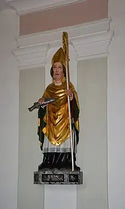 An den Längswänden befindet sich zwischen den Jochen auf Konsolen zwei Standfiguren. Die Darstellung an der südlichen Längswand stammt aus der Zeit um 1430 und zeigt den heiligen Ulrich mit Fisch und Stab. An der nördlichen Längswand befindet sich eine Pieta aus dem 18. Jahrhundert.