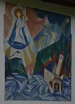 Die Nordwestwand schmückt ein Gemälde von Norbert Strolz. Es zeigt ein Marienbild mit der Zerstörung der alten Kapelle und die Inschrift "DER SCHMERZHAFTEN MUTTER / 1966 IN GROSSER WASSERNOT VERLOBT / 1968 ALS ZEICHEN DES GLAUBENS / UND DANKES WIEDERBAUT."