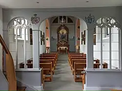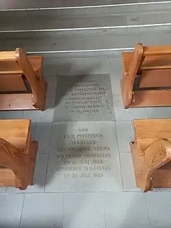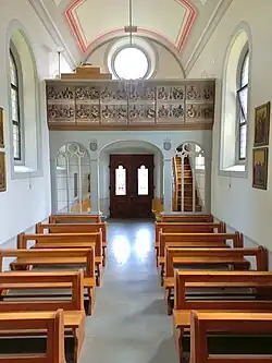 Das Innere ist schlicht ausgestattet. Im «Kreuzgang» vor dem Altar finden sich in den beiden Durchgangsbogen Medaillons von ehemaligen Herrschern Europas, wie Kaiser Karl dem Grossen, verschiedenen französischen Königen wie Ludwig XIV. bis zu Herzogen von Parma. Vor den Stufen zum Altar befinden sich zwei Grabplatten, die an Pia (1877–1915) bzw. Isabella von Bourbon-Parma (1898–1984) erinnern, welche in dieser Kapelle die letzte Ruhe gefunden haben.