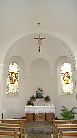 Der Betraum hat ein Tonnengewölbe und eine eingezogene Chorwand, in der sich in der Mitte ein Kruzifix befindet. In der Fassade befinden sich Rundbogenfenster, über der Türe ein Rosettenfenster.[3]