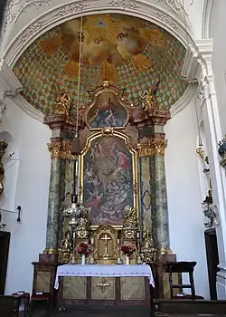 Die Deckenmalerei von 1737 über Maria Magdalena wird Johannes Zick zugeschrieben. Auf der Halbkuppel über dem Hochaltar aus Stuckmarmor ist das Auge der Vorsehung zu erkennen. Das Altarretabel hat Johannes Zick mit den Sieben Zufluchten und der Himmelfahrt Mariens bemalt.