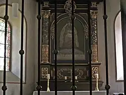 • Der bauzeitliche Altar mit dem Stifterwappen der Familie von Frentz zu Kendenisch und gedrehten Säulen von Frentz zu Kendenich, ist eine Arbeit aus der Bauzeit der Kapelle.
