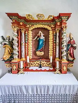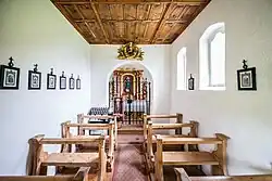 Die Kapelle ist innen einfach gestaltet mit einer geraden Holzdecke mit langgezogenen schlichten Kassetten (Holzfelderdecke). Der markant eingezogene rundbogige Chorbogen grenzt den Altarraum deutlich vom Betraum ab und ist zusätzlich noch mit einem Metallgitter abgeschottet. Der Chorraum ist gewölbt und befindet sich nordöstlich. Der überwiegend rot-goldene, viersäulige, kleine Altaraufbau stammt aus dem Barock, etwa um 1700. Vor dem Altar steht ein Pult, welches die hl. Anna mit Maria zeigt und aus dem 19. Jahrhundert stammt. In der Mitte des Altars befindet sich eine Statue der Maria mit Kind, links des hl. Andreas und rechts des hl. Nikolaus. Über dem Chorbogen eine Akanthuskartusche mit Relief Gottvater aus der Zeit um 1700.