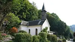 Die handwerklich gut ausgeführten, stabilen Türen und der viereckige Glockendachreiter auf dem Satteldach befinden sich nordwestlich. Das Satteldach ist mit Faserzementplatten gedeckt und der Glockendachreiter mit Kupferblech eingeschlagen. Oberhalb der Eingangstüre befindet sich ein rundes Fenster mit Sandsteineinfassung und einer bunten Glasrosette. Das Langhaus weist je zwei Rundbogenfenster auf.