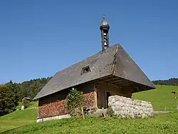 Es handelt sich um einen Bau mit annähernd rechteckiger Grundform und West-Ost-Ausrichtung mit weit vorgezogenem Dach über dem Haupteingang. Das Satteldach mit zwei kleinen Gaupen, je berg- und talseitig, ist mit Eternit-Schindeln und der Glocken-Dachreiter mit Turmhaube in „Zwiebelform“ mit Kupfer eingedeckt. Der Glocken-Dachreiter befindet sich östlich, die angebaute Sakristei und der Altar westlich.
