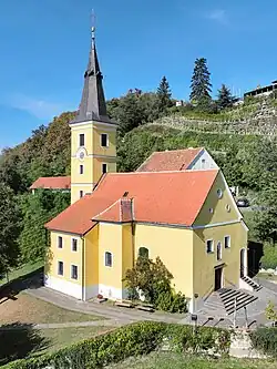 - Katholische Pfarrkirche Kapfenstein hl. Nikolaus steht in einer Hanglage südlich unterhalb des Schlosses.