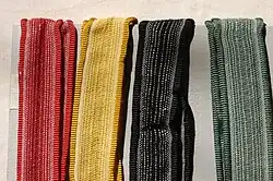 Das Kapitalband wird heute in einer Weberei hergestellt und fertig von der Buchbinderei gekauft. Der Buchbinder muss nun nur noch die nötigen Stücke abschneiden und an die Ober- und Unterkante des Buchrückens ankleben.