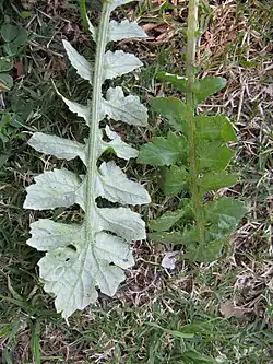 Die in einer grundständigen Rosette und am Stängel verteilt angeordneten Laubblätter sind in Blattstiel und -spreite gegliedert. Die Blattspreite ist bei einer Länge von 5 bis 25 sowie einer Breite von 2 bis 5 Zentimetern die obersten fast einfach und verkehrt-eiförmig; die unteren fiederlappig bis leierförmig fiederspaltig. Die Blattoberseite in fein spinnwebartig behaart und die -unterseite ist dicht weiß filzig oder wollig behaart.[7][2]