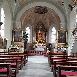 Das Kircheninnere zeigt ein Langhaus unter einem Stichkappentonnengewölbe über Pilastern mit Kämpfergesimsen. Der rundbogige Triumphbogen ist abgefast. Stuckbänder als Blattstab zieren die Gewölbegrate im Langhaus.