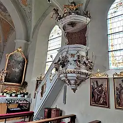 Die Seitenaltäre zeigen barocke Altarbilder, links Josef, und rechts Christophorus und Antonius von Padua, laut Inschrift 1717 von Christoph Störzinger gestiftet. Es gibt zahlreiche Votivbilder aus dem 18. und 19. Jahrhundert.