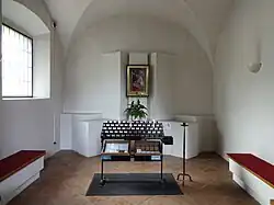 Der Kirchenraum besitzt ein schmuckloses Tonnengewölbe. Sein Ausstattungskonzept, das von Franz Pöhacker[4] entworfen worden ist, ist im Sinne franziskanischer Einfachheit auf Holzinventar ausgerichtet.
