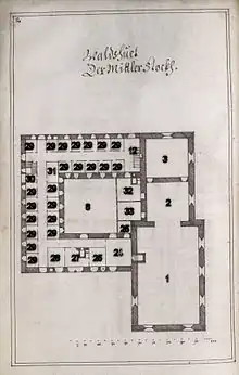 Der vierflügelige Konventstrakt, das Quadrum, westlich der Kirchen wurde durch den Eingangskorridor (7) erschlossen. Der verschmälerte Ostflügel (9) beinhaltete das Oratorium (10) mit Fenster zum Psallierchor. Klosterhofseitig (8) war eine halboffene Galerie (9) angelegt. Über eine Tür zur Klausur gelangte man in die geschlossene Galerie (11) des Südflügels, die das Treppenhaus (12), das heizbare Refektorium der Brüder (13) und die Klosterküche (14) erschloss. Im wieder außerhalb der Klausur gelegenen Westflügel lag eine wiederum geschlossene Galerie (15), die zum Waschraum (17) und dahintergelegenen Loca secreta (18) führte. Die davorgelegene über die Küche erreichbare Speisekammer war über ein zweites Treppenhaus (16), mit der Fruchtschütte und dem Keller verbunden. Im Nördlichen Querflügel, der wiederum durch eine halboffene Galerie (19) außerhalb der Klausur erschlossen wurde, lagen westlich das mit einem Ofen versehene Pilgerzimmer (20), der Speiseraum für Arme und Bedürftige (21), ein Besucher- oder Beichtzimmer (22) und das Sprechzimmer (23).