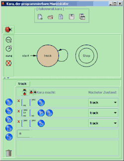 Im Gegensatz zum normalen Kara können hier bis zu vier Marienkäfer nebenläufig eingesetzt werden und einzeln – immer noch grafisch – programmiert werden.